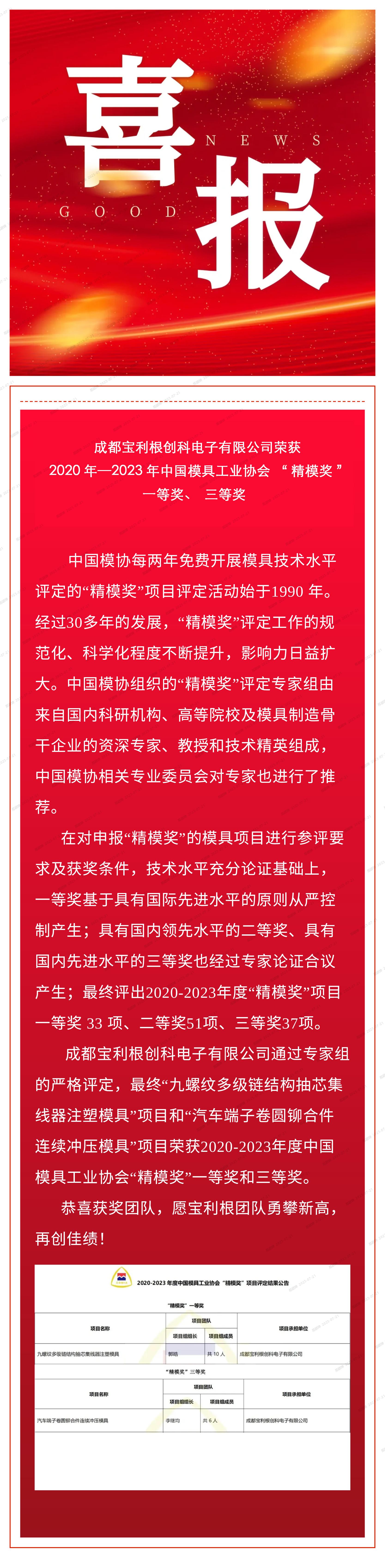 喜报——成都亚洲必赢创科电子有限公司荣获 2020年—2023年“精模奖”一等奖、三等奖